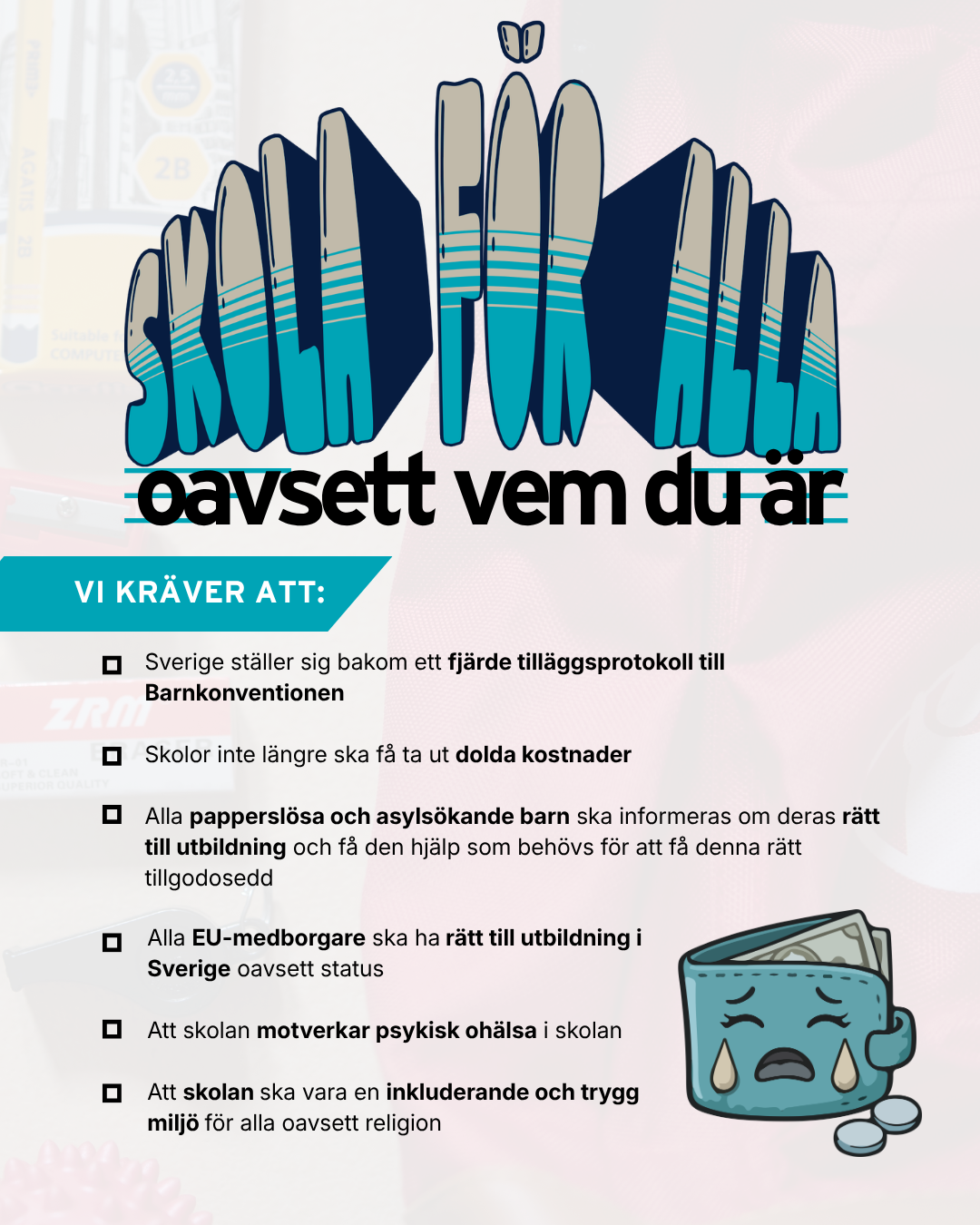 Skolor inte längre skata ut dolda kostnader: Enligt lagen får skolan ta ut en mindre summa pengar, men då barnfattigdomen ökar ser vi att det skapar klyftor och utanförskap bland barn. Vi tycker att skolan ska vara jämlik för alla barn. I dagsläget har inte alla barn råd att betala för saker såsom pennor, block, kollektivtrafik, skidor eller lunch vid utflykter.